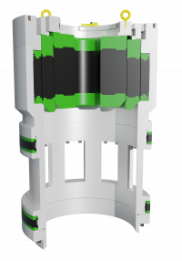 Developed for Drillships and Semisubmersible rigs. Available for 49½”, 60 ½” and 75 ½” rotary tables, and pressure rated from 500 to 2000 psi. Uses a single a packing element to enable closing range from 0” to 21”.